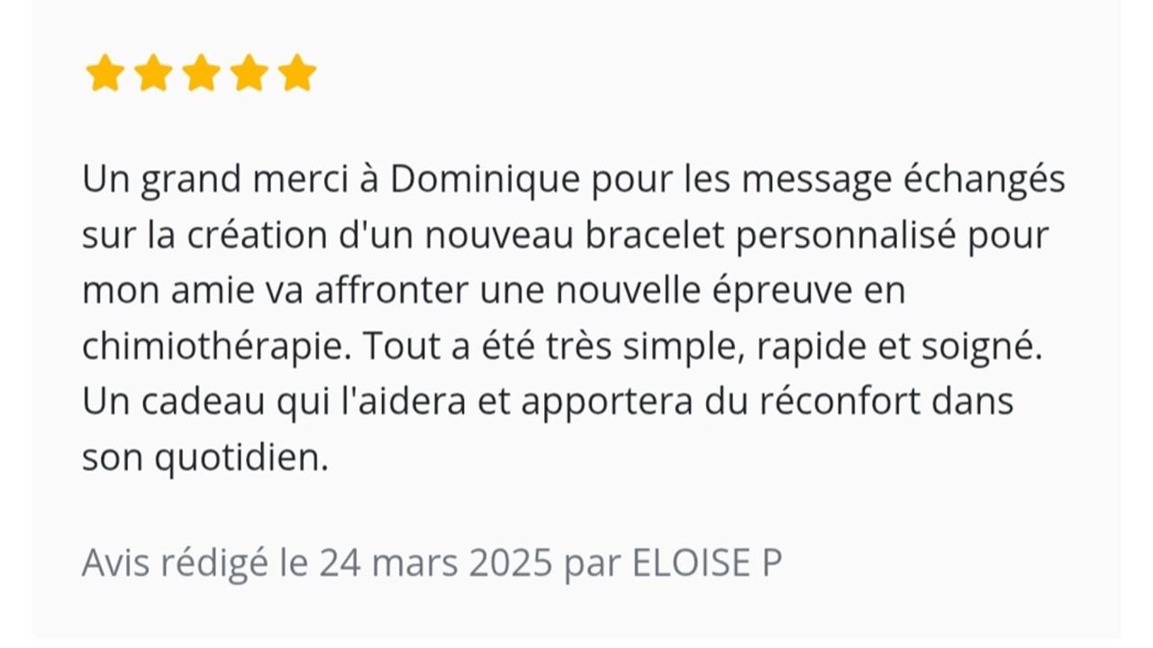 Depuis 9 ans, j'accompagne personnellement chaque cliente pour créer un bracelet qui lui correspond vraiment.