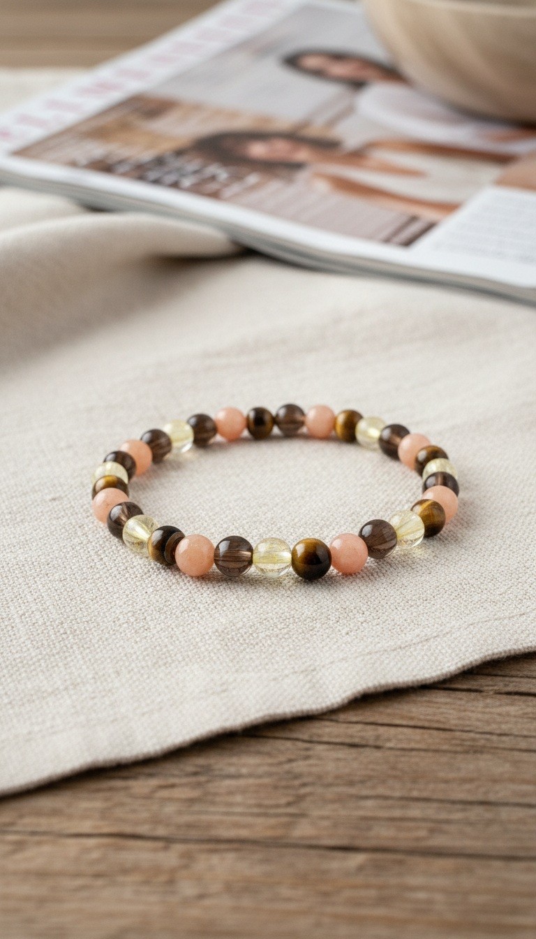 Ce bracelet extensible en pierres naturelles sur le thème de la confiance en soi se compose de calcite, de citrine, de quartz fumé et d'oeil de tigre.
