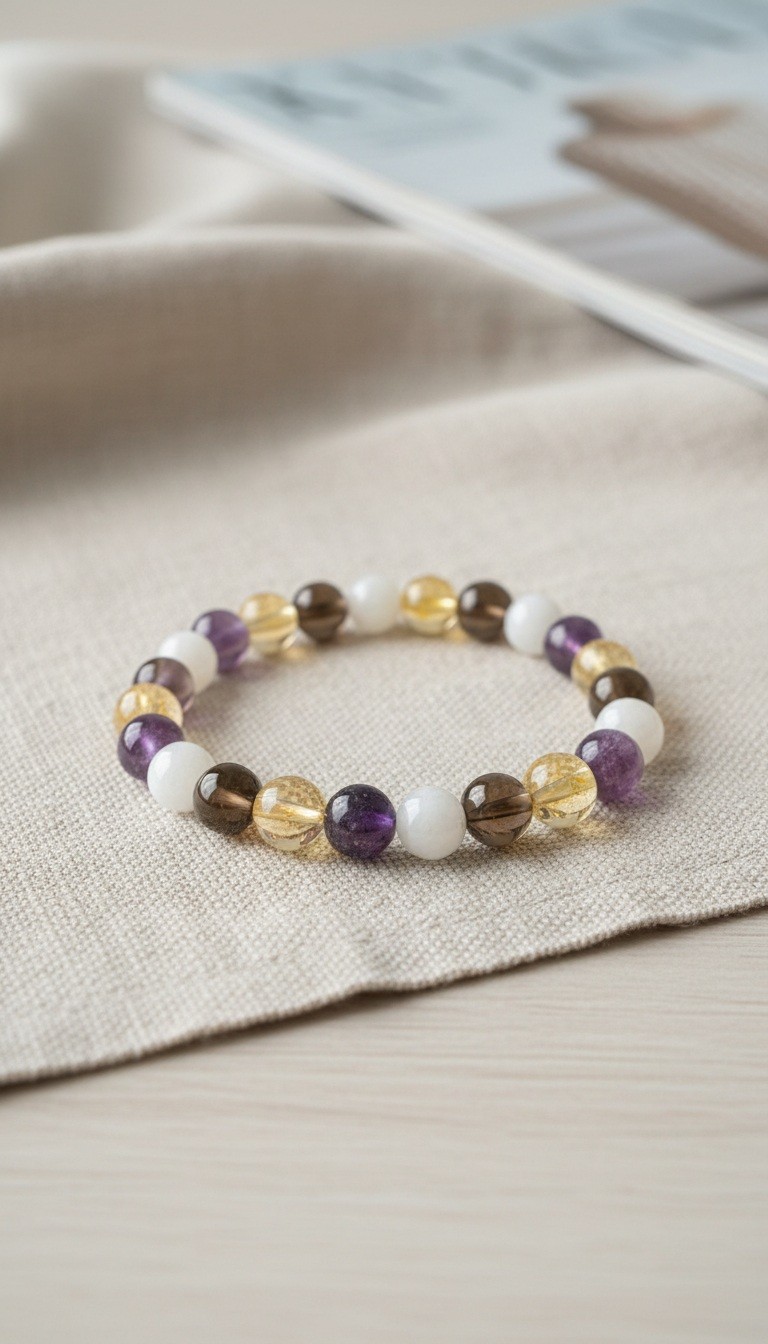 Bracelet stress en pierre de lune, quartz fumé, lépidolite et citrine pour cadeau femme en pierres naturelles 8mm