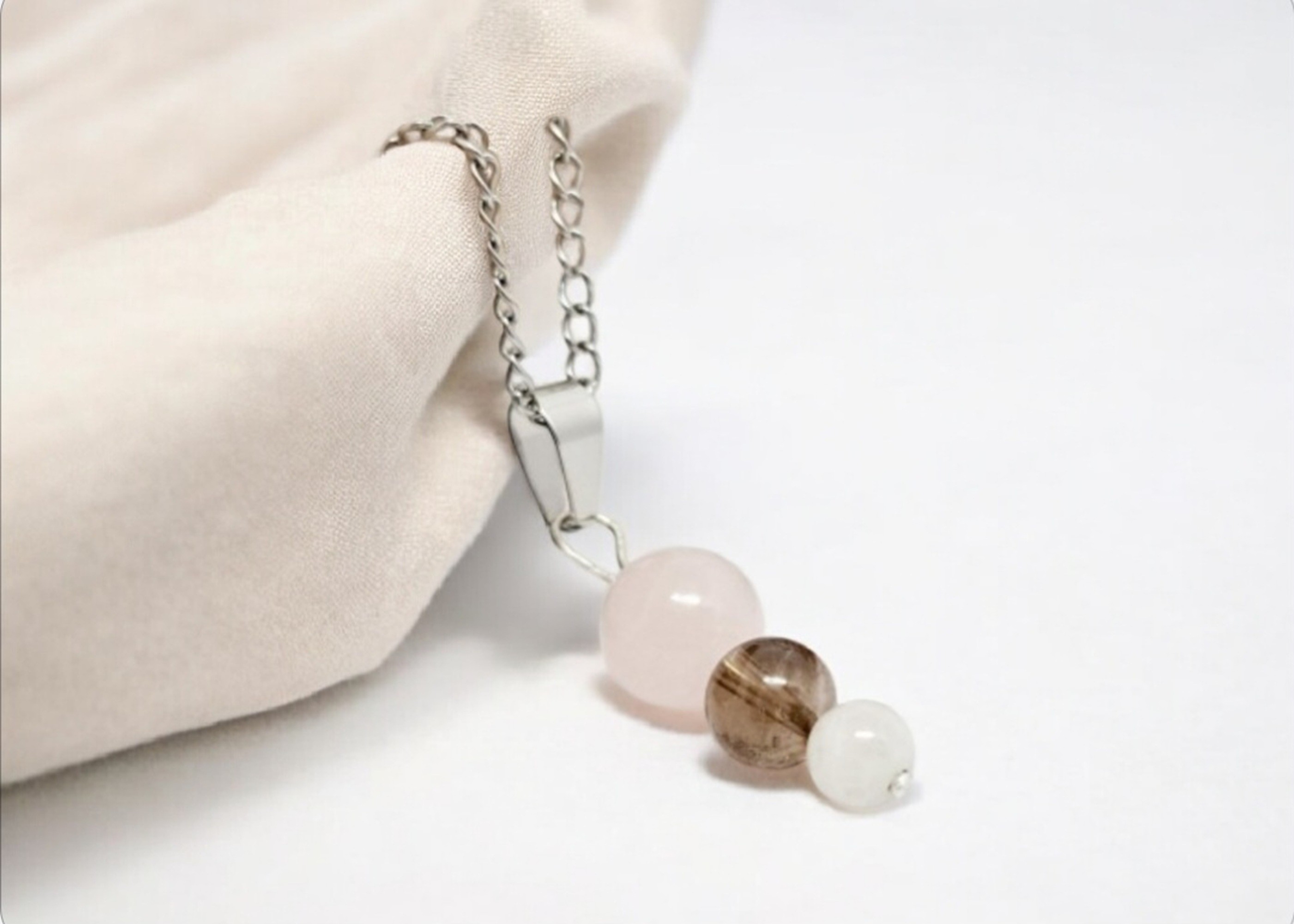 Cadeau maman , Pendentif trio douceur en quartz rose, quartz fumé et pierre de lune, cadeau fait mains femme en pierres naturelles