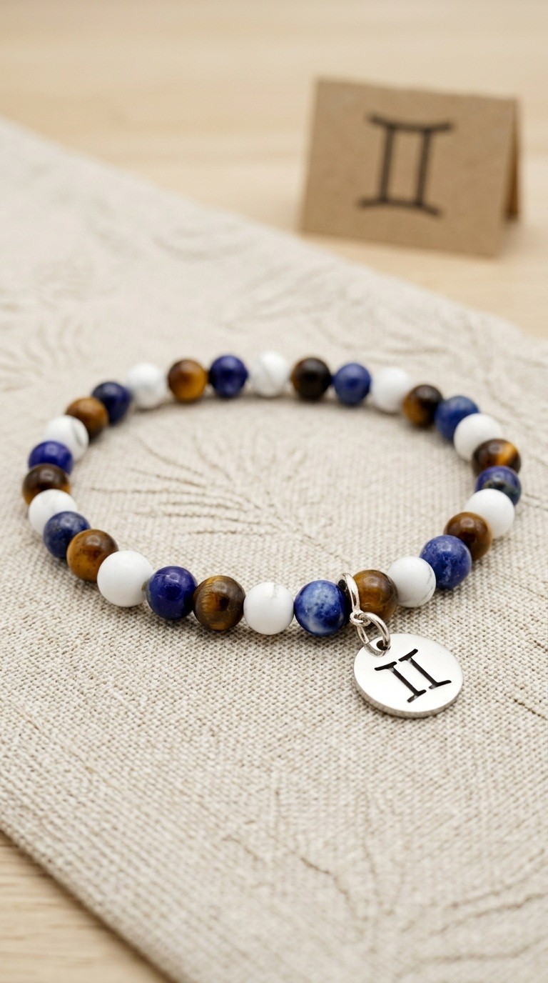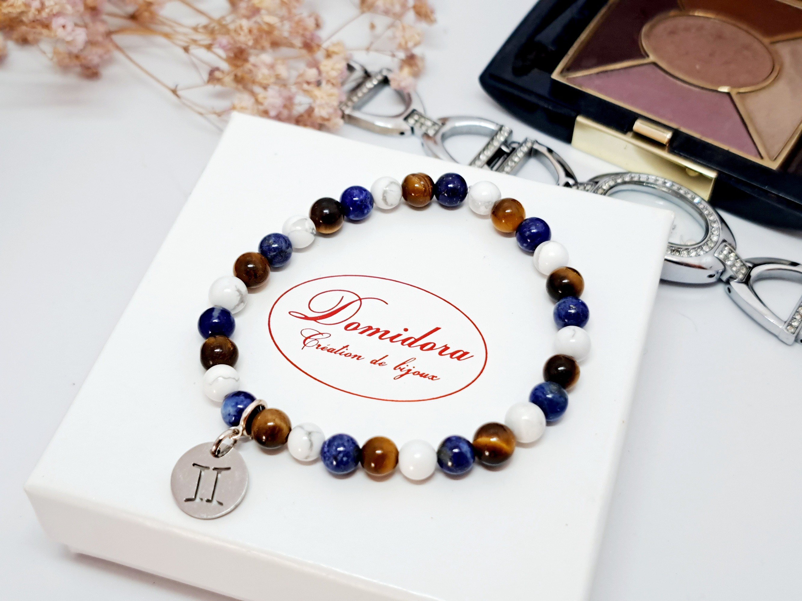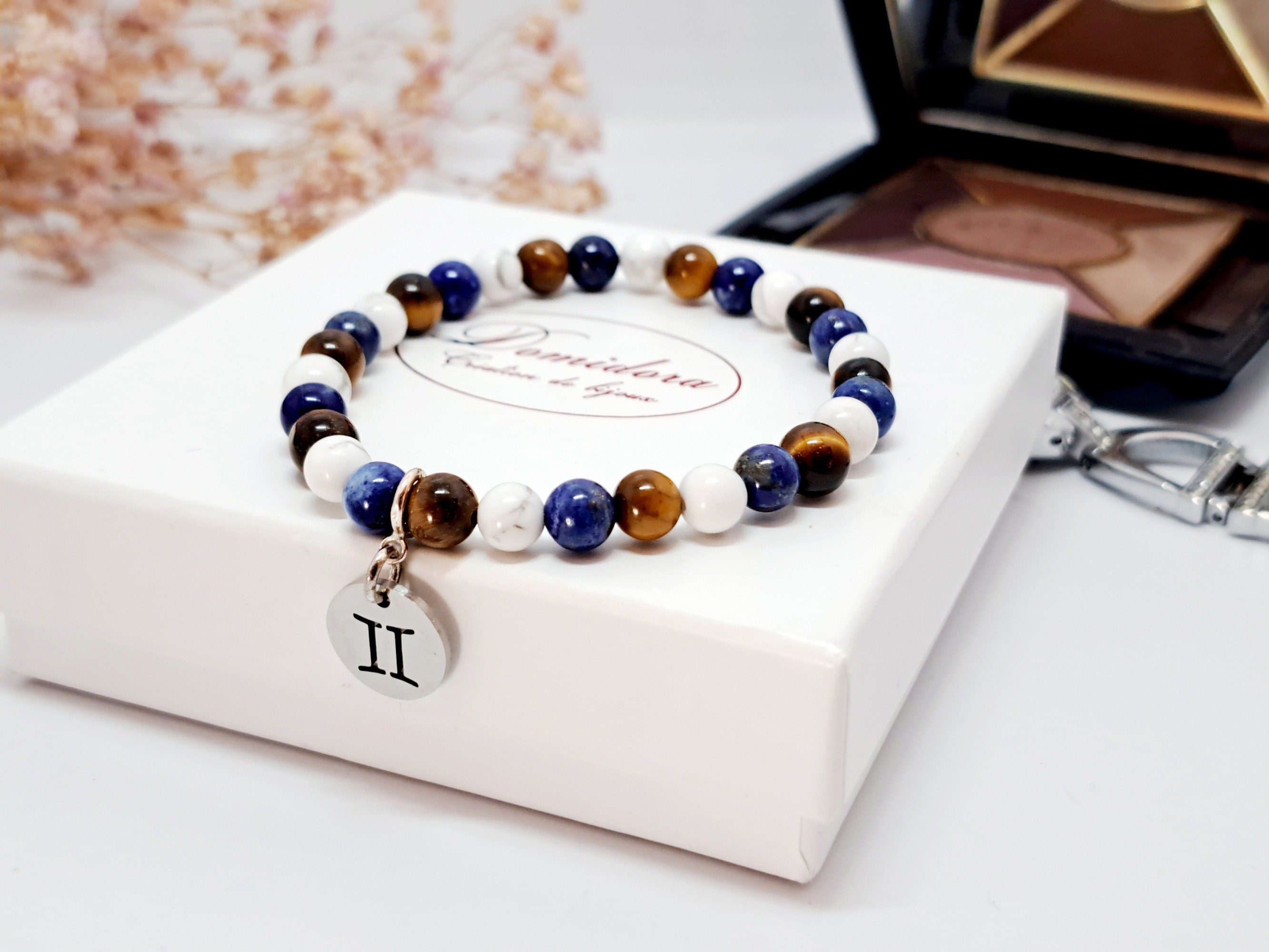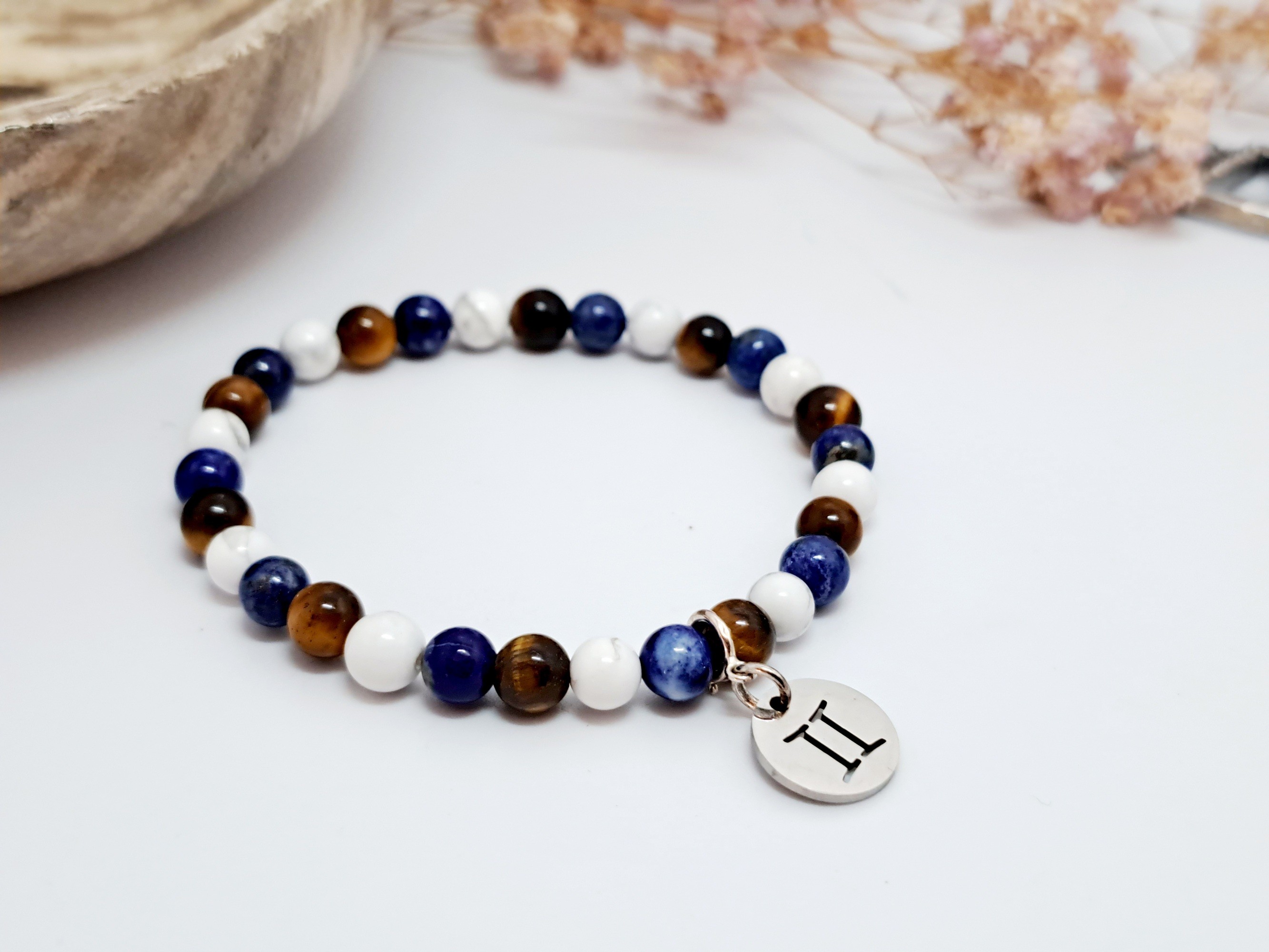 Bracelet astrologique natif des gémeaux, pierres naturelles oeil de tigre, lapis lazuli et howlite