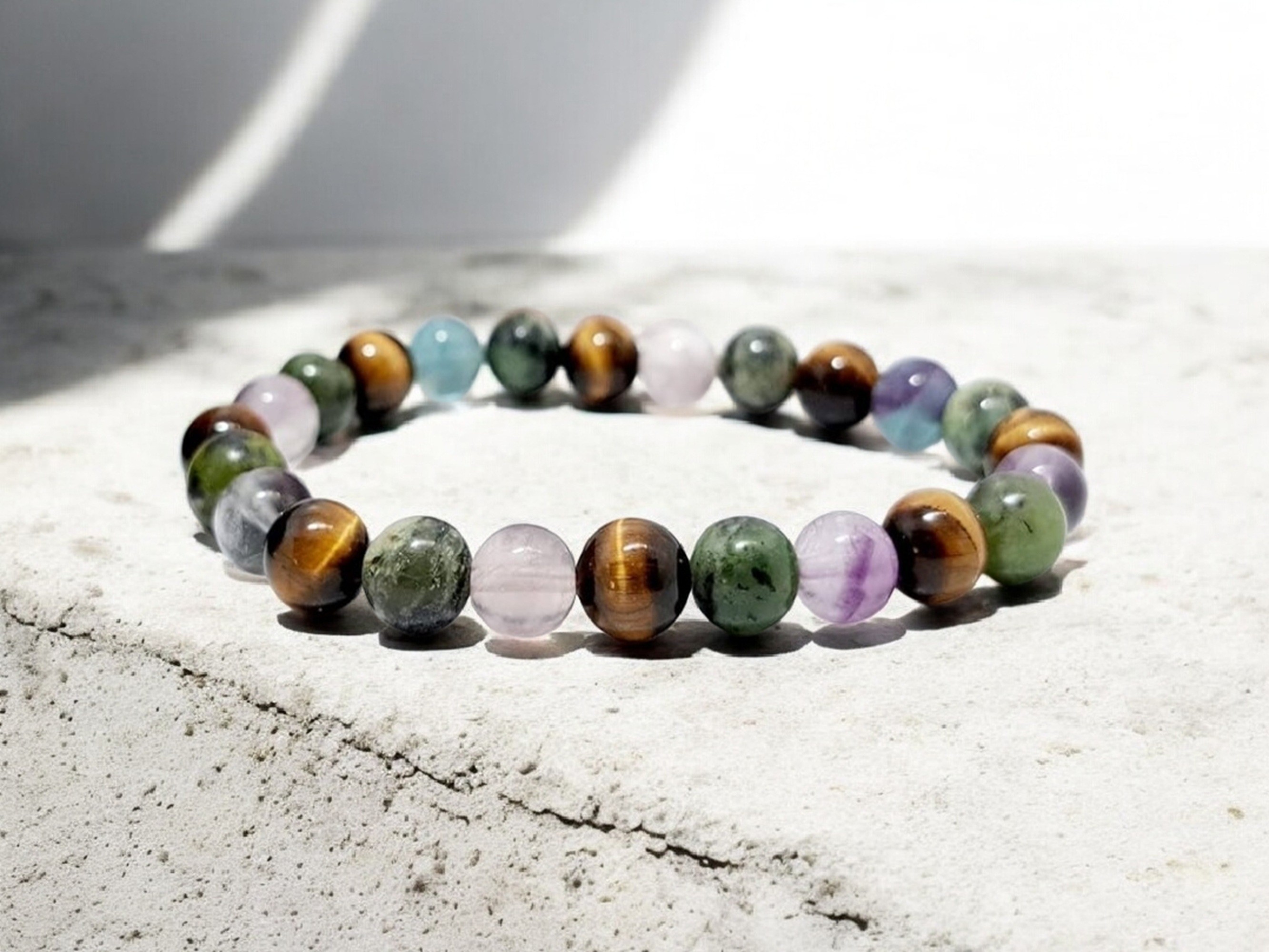 - Bien-être et harmonie : Profitez des vertus combinées du jade néphrite, de la fluorine et de l'oeil de tigre pour un équilibre émotionnel et spirituel.