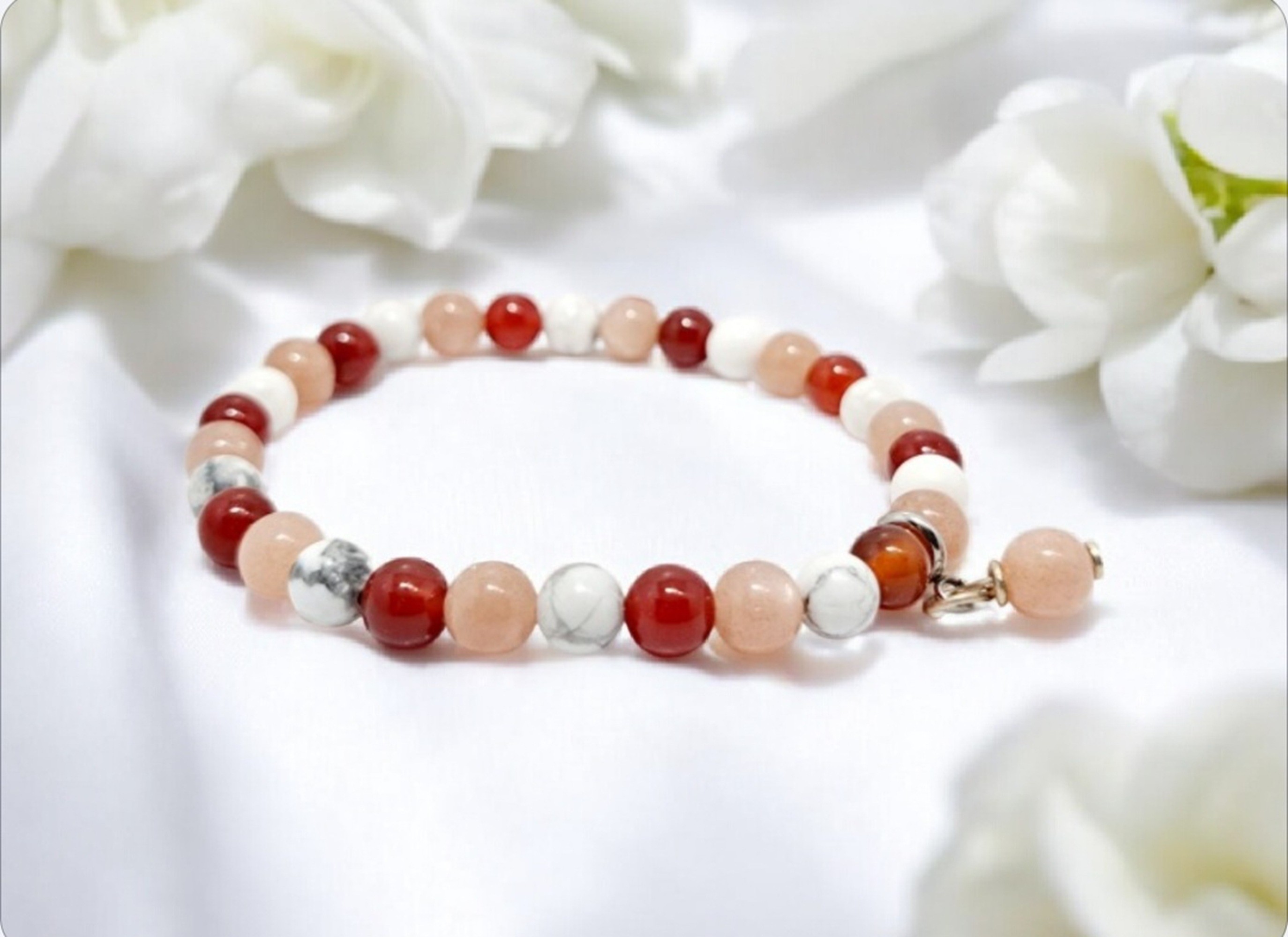 La pierre de soleil, la howlite et la cornaline forment une association pour tempérer l'impulsivité et les émotions.