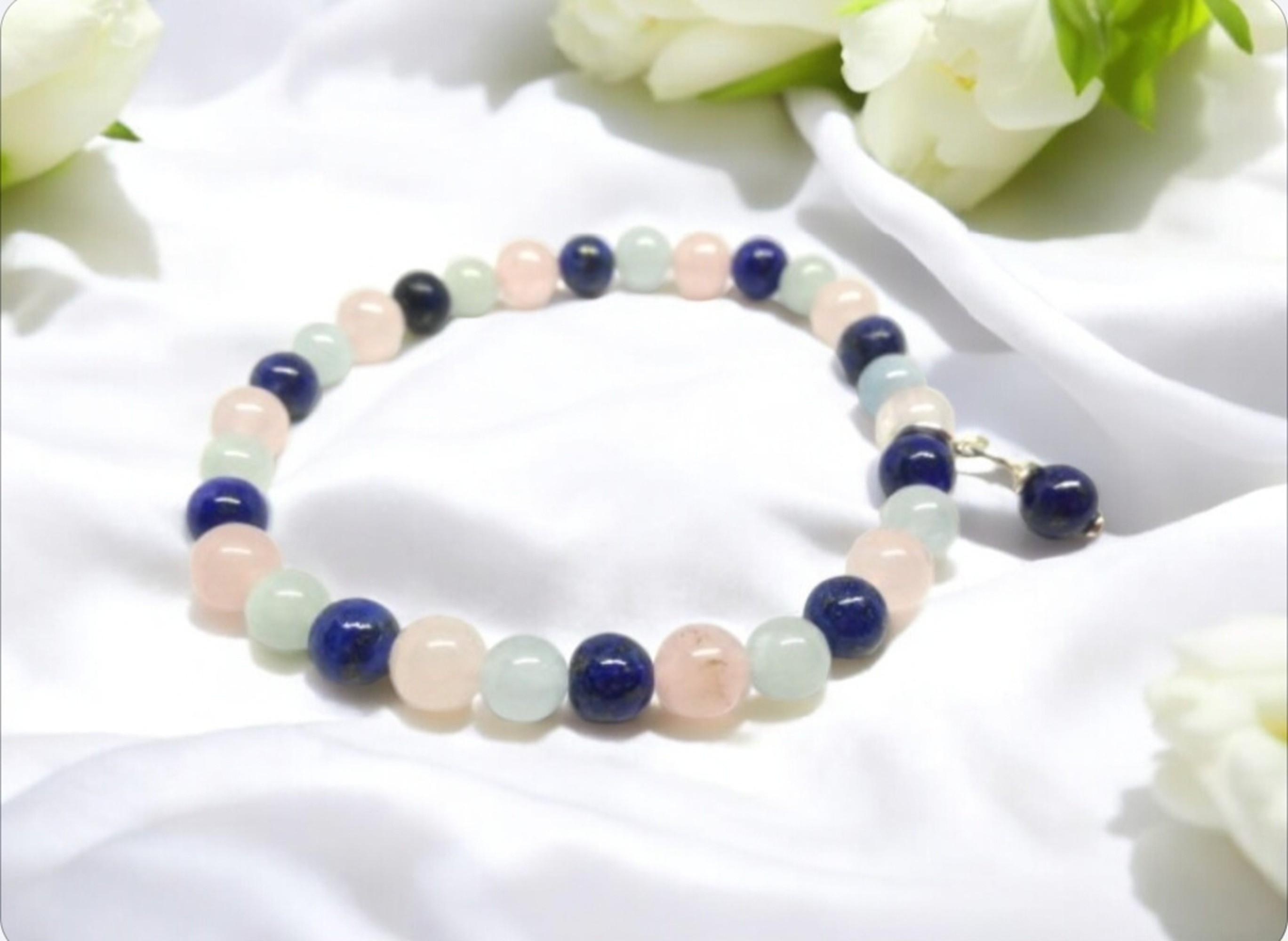 Pour favoriser l'harmonie et encourager la prise de responsabilités, le lapis lazuli s'associe ici à l 'aigue marine et au quartz rose.