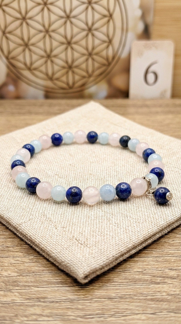 - Pierres Naturelles : Lapis-Lazuli, Aigue-Marine et Quartz Rose (Perles de 6 mm de grade supérieur).