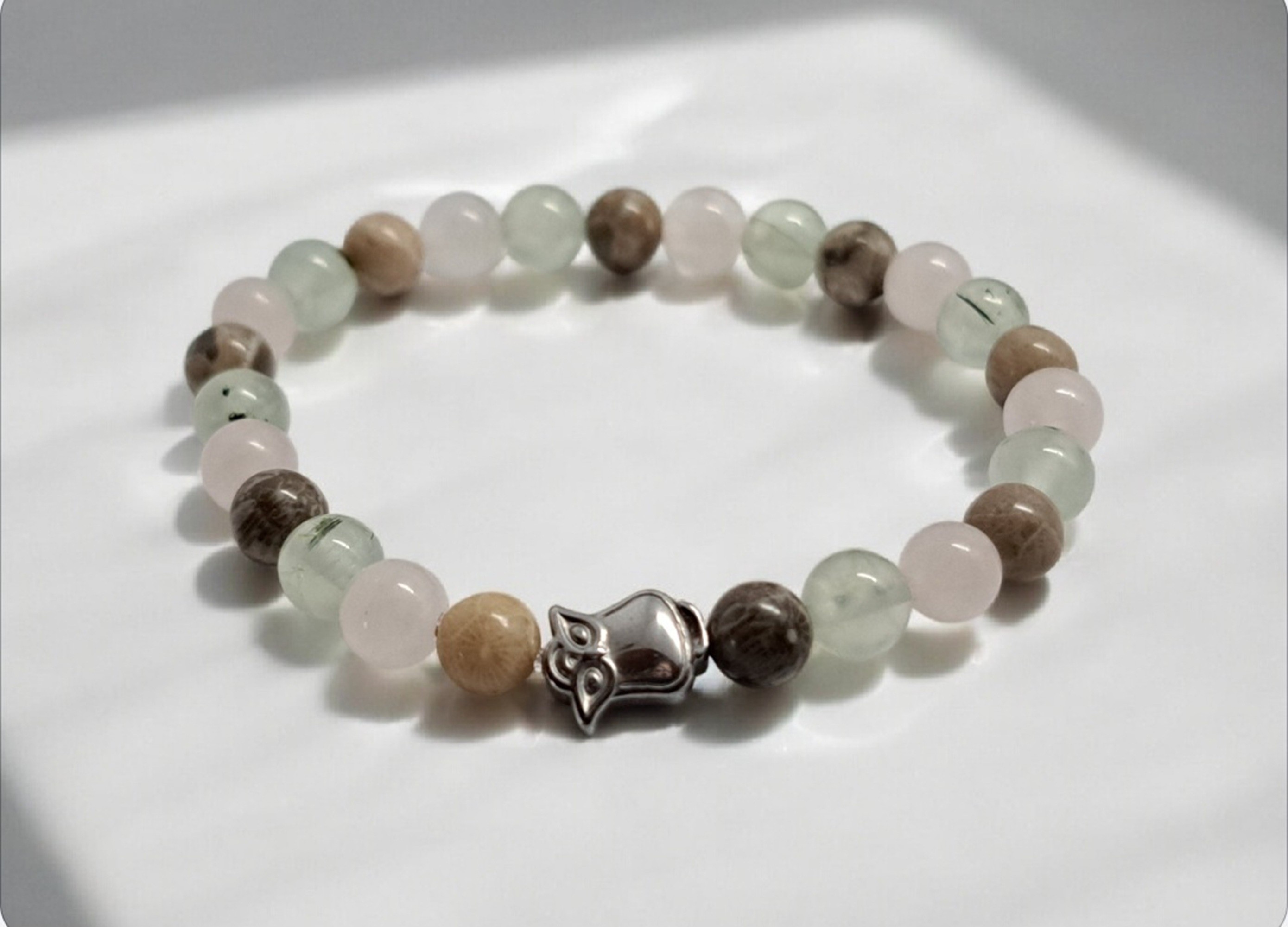 *Ce bracelet se compose de trois pierres : la préhnite, le quartz rose et le bois fossile.