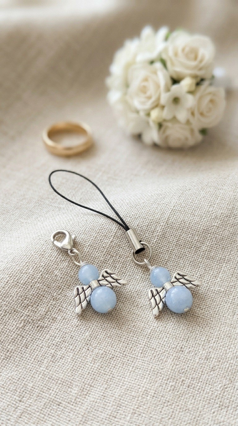 Le grand jour approche et chaque détail doit être parfait. Vous cherchez encore votre "quelque chose de bleu" ? Ne cherchez plus. J'ai créé pour vous ce délicat ange en Célestine naturelle, une pierre à la teinte azur sacrée, symbole de fidélité et de paix intérieure.
