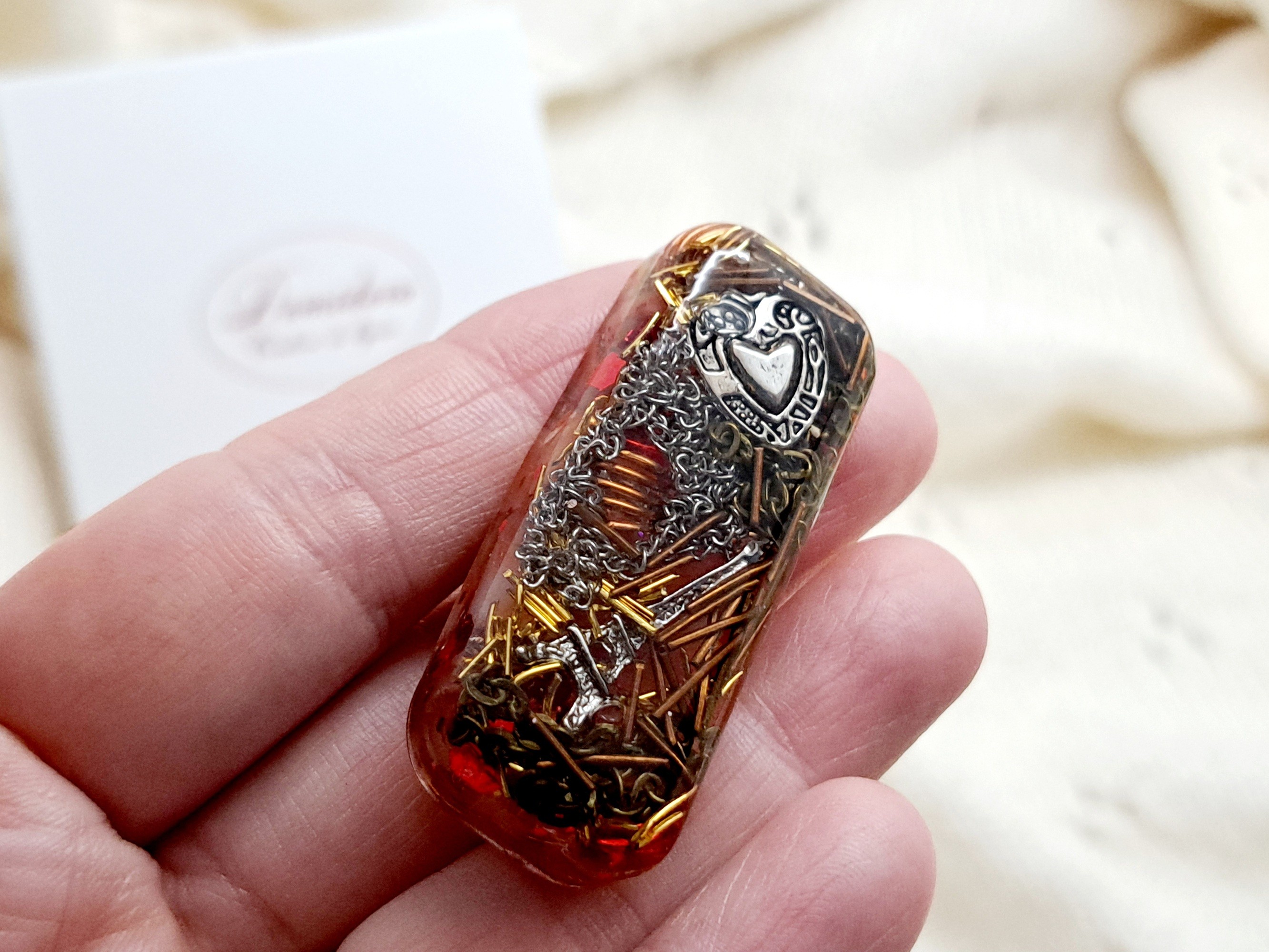 Offrez-vous ou à un proche une orgonite de poche unique, conçue à la main en résine et pierre naturelle de cornaline.