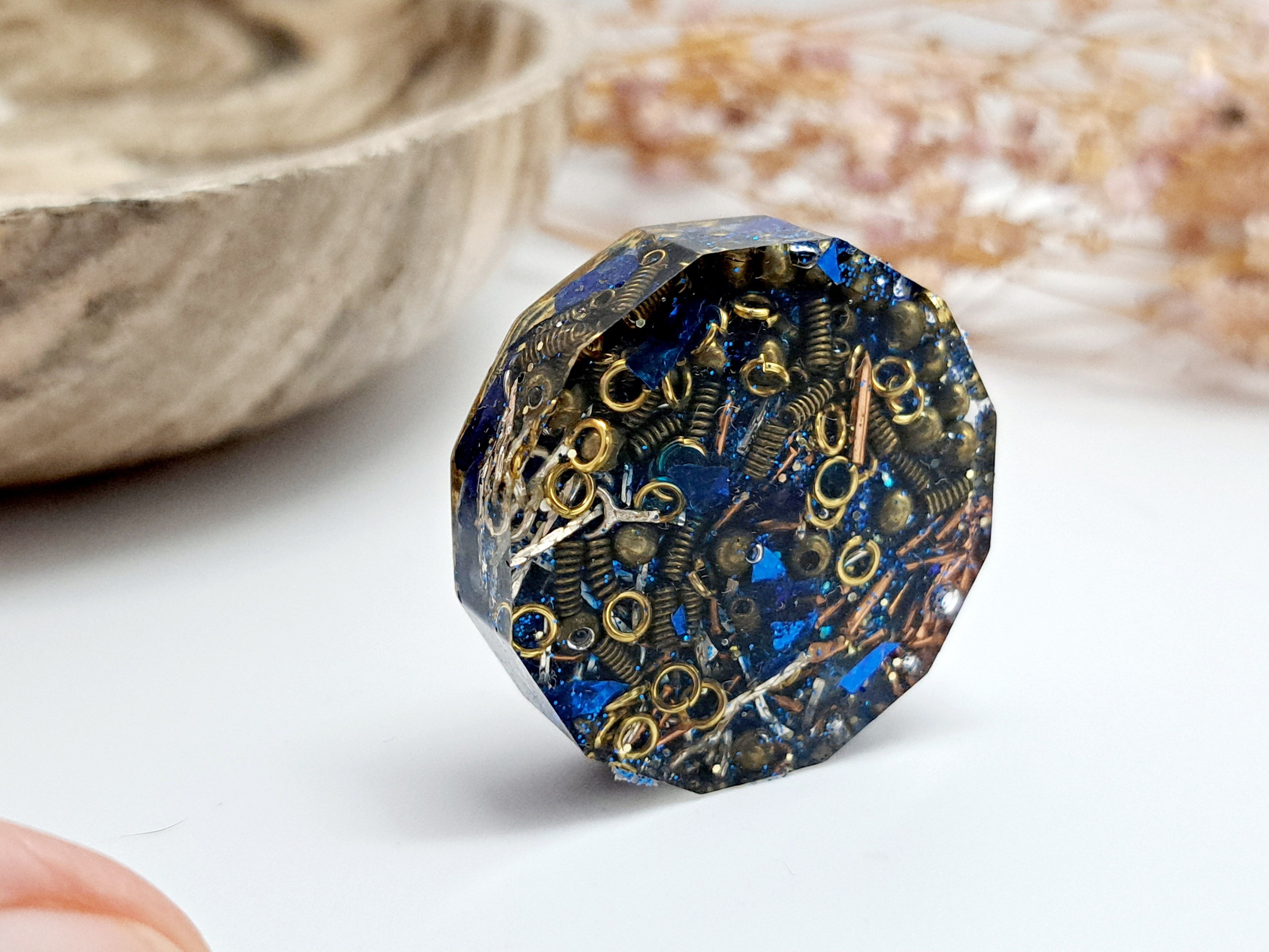 ?Façonnée à la main en résine, elle contient des copeaux de cuivre et des éclats de lapis lazuli, pierre de protection et de sagesse.