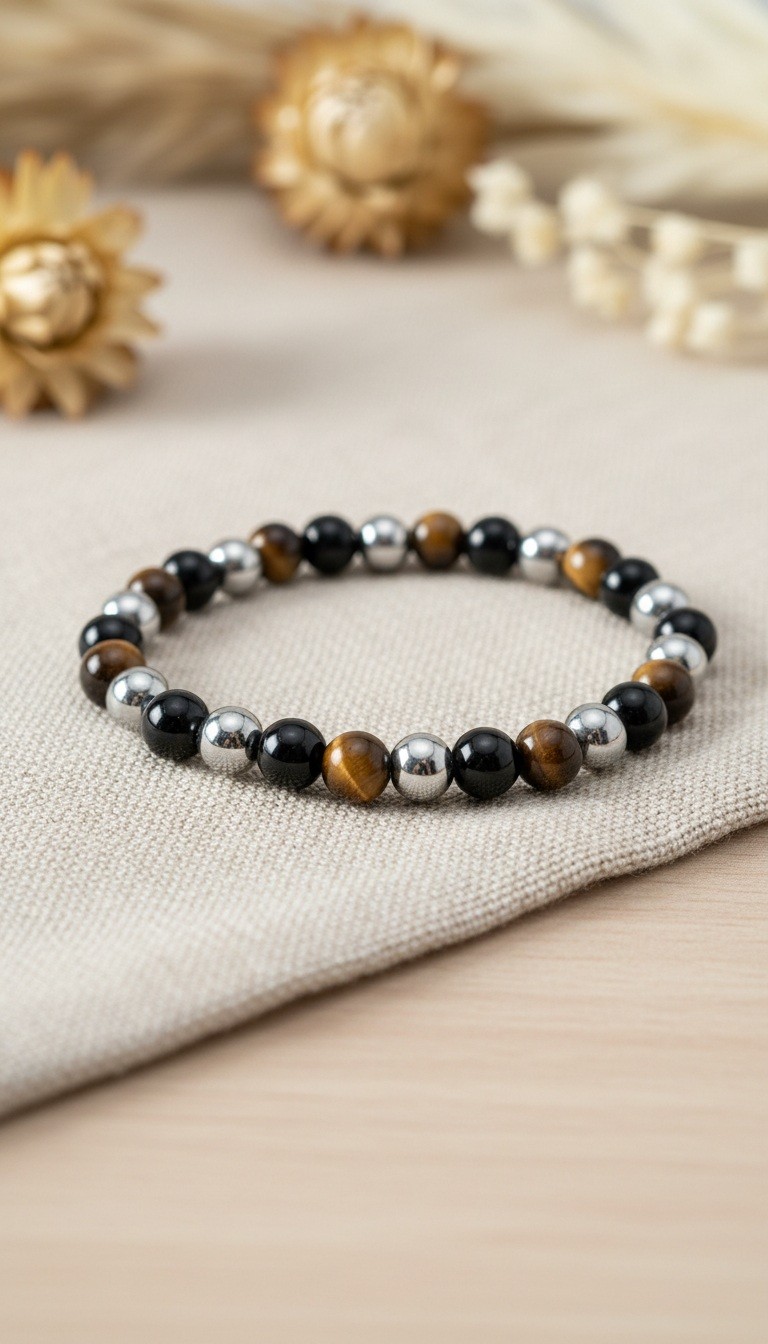 Bracelet Triple Protection en Pierres Naturelles - Œil de Tigre, Hématite et Obsidienne