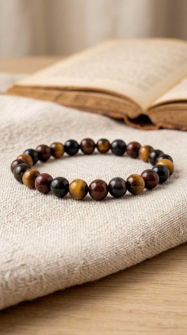 Bracelet en pierres naturelles de protection qui associe l'oeil de tigre, l'oeil de taureau et l'oeil de faucon.