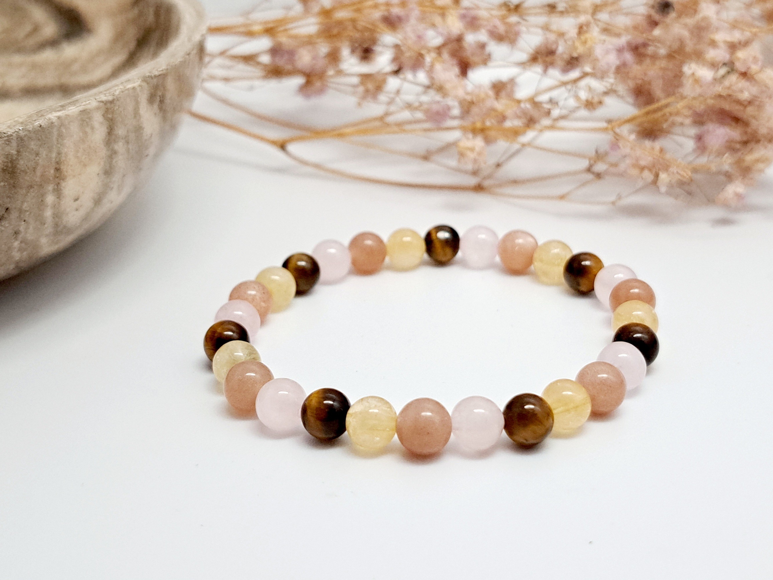 Ensemble, nous avons réalisé ce bracelet en pierre de soleil, citrine, quartz rose et oeil de tigre.
