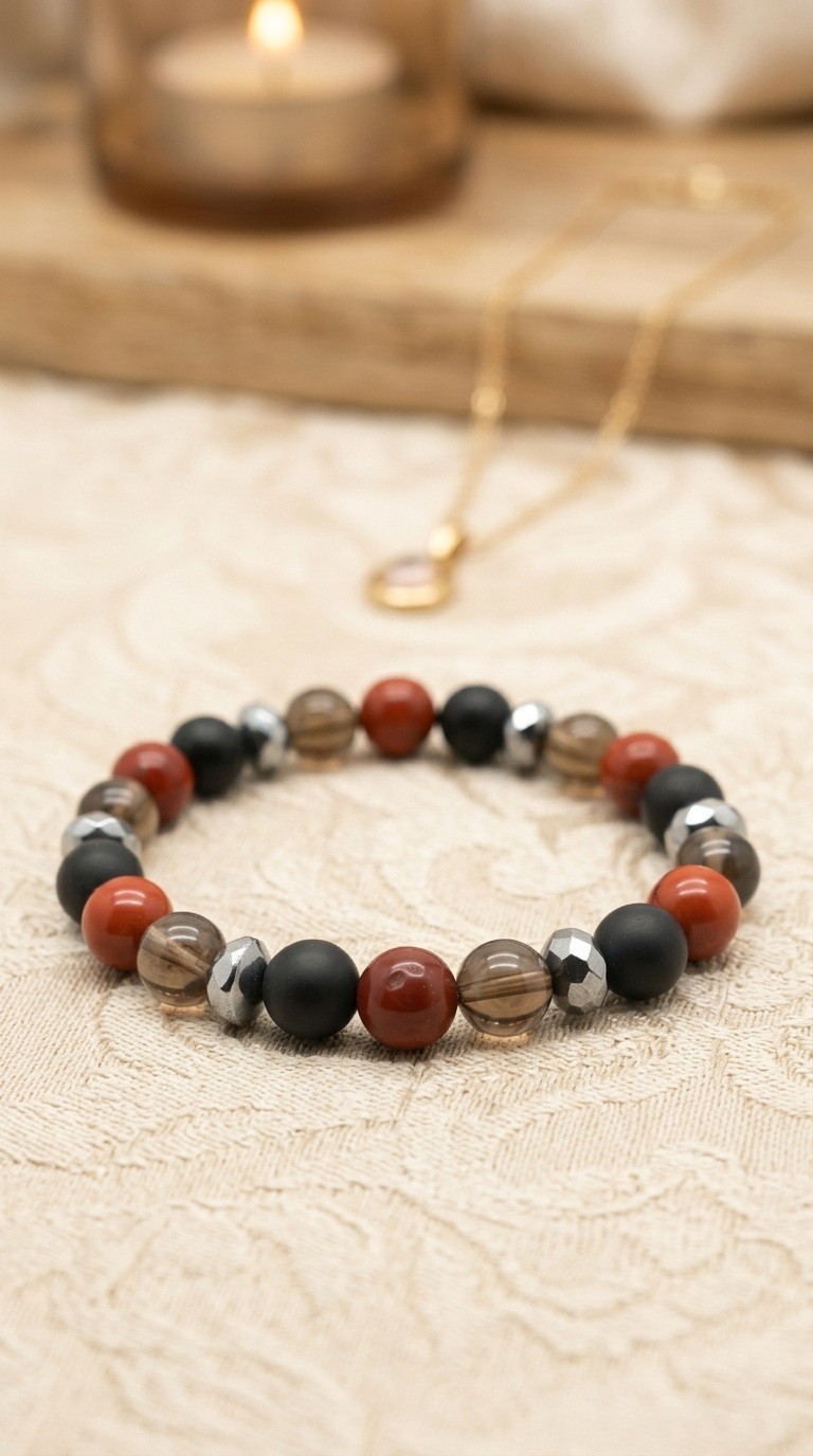 Bracelet Confiance en Soi et Ancrage en Pierres Naturelles - Jaspe Rouge, Onyx et Quartz Fumé